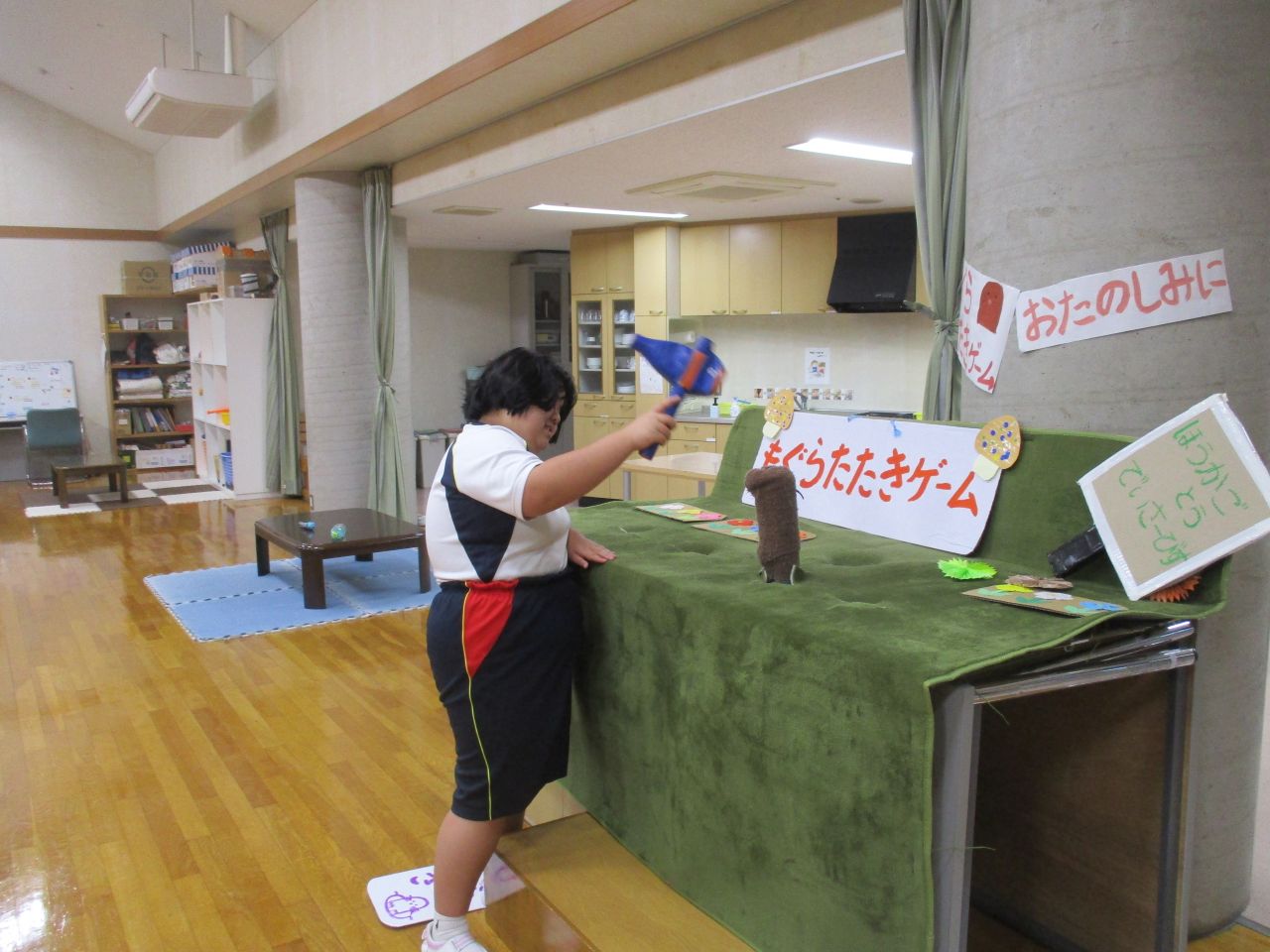 好評⁉だったもぐらたたきゲームを活動の時間にも取り入れました。もぐらたたきは、集中力や目と手の協調性を養い、変化がある楽しいゲームです。数を数えながらたたく利用者や中を覗き込む利用者もいて、楽しい活動時間となりました。機会があったら、また利用者の皆さんと楽しみたいと思います。